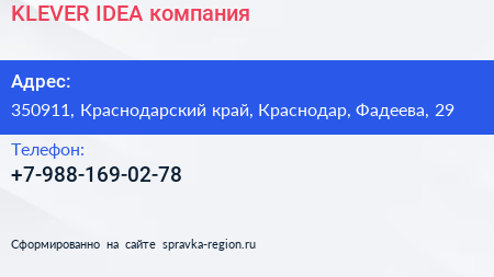 KLEVER IDEA, компания по адресу 350911, Краснодарский край, Краснодар, Фадеева, 29 в дальнейшем Организация, размещена в следующих категориях: