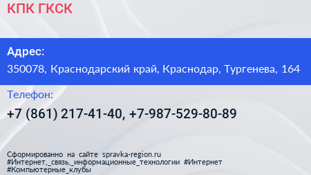 КПК ГКСК по адресу 350078, Краснодарский край, Краснодар, Тургенева, 164 в дальнейшем Организация, размещена в следующих категориях:
