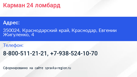Карман 24, ломбард по адресу 350024, Краснодарский край, Краснодар, Евгении Жигуленко, 4 в дальнейшем Организация, размещена в следующих категориях:
