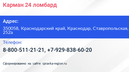 Карман 24, ломбард по адресу 350058, Краснодарский край, Краснодар, Ставропольская, 252а в дальнейшем Организация, размещена в следующих категориях: