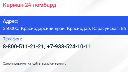 Карман 24, ломбард по адресу 350000, Краснодарский край, Краснодар, Карасунская, 86 в дальнейшем Организация, размещена в следующих категориях: