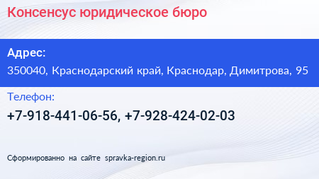 Консенсус, юридическое бюро по адресу 350040, Краснодарский край, Краснодар, Димитрова, 95 в дальнейшем Организация, размещена в следующих категориях: