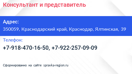 Консультант и представитель по адресу 350059, Краснодарский край, Краснодар, Ялтинская, 39 в дальнейшем Организация, размещена в следующих категориях: