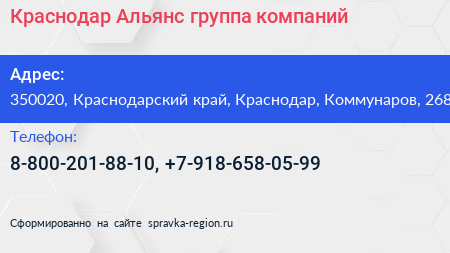Краснодар-Альянс, группа компаний по адресу 350020, Краснодарский край, Краснодар, Коммунаров, 268 в дальнейшем Организация, размещена в следующих категориях: