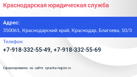Краснодарская юридическая служба по адресу 350061, Краснодарский край, Краснодар, Благоева, 10/3 в дальнейшем Организация, размещена в следующих категориях: