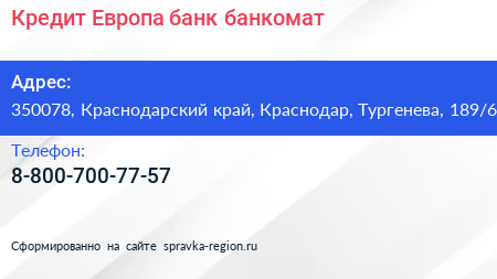 Кредит Европа банк, банкомат по адресу 350078, Краснодарский край, Краснодар, Тургенева, 189/6 в дальнейшем Организация, размещена в следующих категориях: