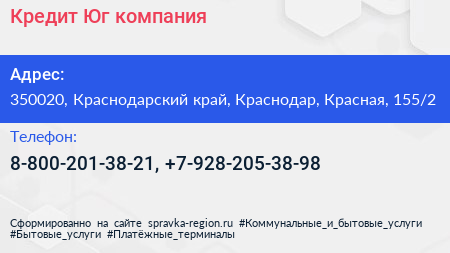Кредит Юг, компания по адресу 350020, Краснодарский край, Краснодар, Красная, 155/2 в дальнейшем Организация, размещена в следующих категориях: