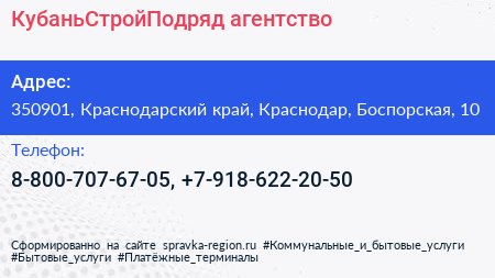 КубаньСтройПодряд, агентство по адресу 350901, Краснодарский край, Краснодар, Боспорская, 10 в дальнейшем Организация, размещена в следующих категориях: