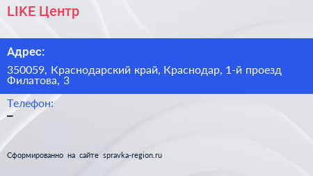 LIKE Центр по адресу 350059, Краснодарский край, Краснодар, 1-й проезд Филатова, 3 в дальнейшем Организация, размещена в следующих категориях: