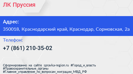 ЛК Пруссия по адресу 350018, Краснодарский край, Краснодар, Сормовская, 2а в дальнейшем Организация, размещена в следующих категориях:
