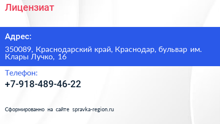 Лицензиат по адресу 350089, Краснодарский край, Краснодар, бульвар им. Клары Лучко, 16 в дальнейшем Организация, размещена в следующих категориях: