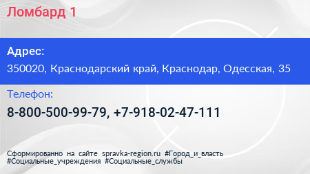 Ломбард №1 по адресу 350020, Краснодарский край, Краснодар, Одесская, 35 в дальнейшем Организация, размещена в следующих категориях: