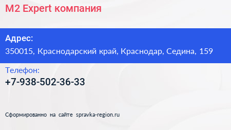 M2 Expert, компания по адресу 350015, Краснодарский край, Краснодар, Седина, 159 в дальнейшем Организация, размещена в следующих категориях: