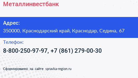 Металлинвестбанк по адресу 350000, Краснодарский край, Краснодар, Седина, 67 в дальнейшем Организация, размещена в следующих категориях: