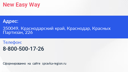 New Easy Way по адресу 350049, Краснодарский край, Краснодар, Красных Партизан, 226 в дальнейшем Организация, размещена в следующих категориях: