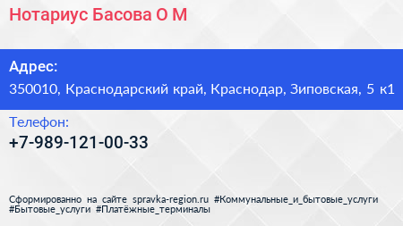 Нотариус Басова О.М. по адресу 350010, Краснодарский край, Краснодар, Зиповская, 5 к1 в дальнейшем Организация, размещена в следующих категориях: