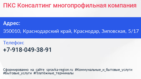 ПКС Консалтинг, многопрофильная компания по адресу 350010, Краснодарский край, Краснодар, Зиповская, 5/17 в дальнейшем Организация, размещена в следующих категориях: