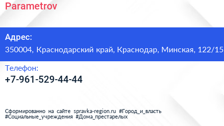 Parametrov по адресу 350004, Краснодарский край, Краснодар, Минская, 122/15 в дальнейшем Организация, размещена в следующих категориях: