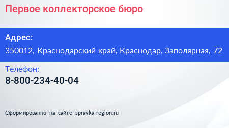 Первое коллекторское бюро по адресу 350012, Краснодарский край, Краснодар, Заполярная, 72 в дальнейшем Организация, размещена в следующих категориях: