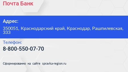 Почта Банк по адресу 350051, Краснодарский край, Краснодар, Рашпилевская, 333 в дальнейшем Организация, размещена в следующих категориях: