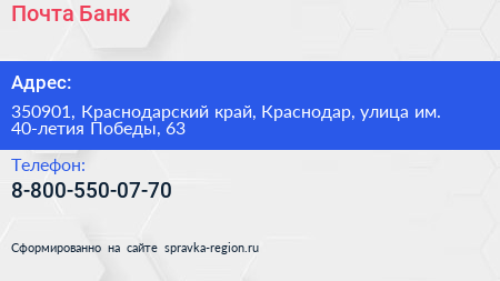 Почта Банк по адресу 350901, Краснодарский край, Краснодар, улица им. 40-летия Победы, 63 в дальнейшем Организация, размещена в следующих категориях: