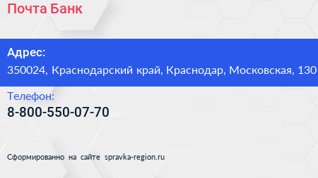 Почта Банк по адресу 350024, Краснодарский край, Краснодар, Московская, 130 в дальнейшем Организация, размещена в следующих категориях: