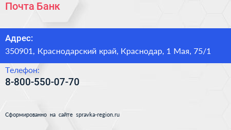 Почта Банк по адресу 350901, Краснодарский край, Краснодар, 1 Мая, 75/1 в дальнейшем Организация, размещена в следующих категориях: