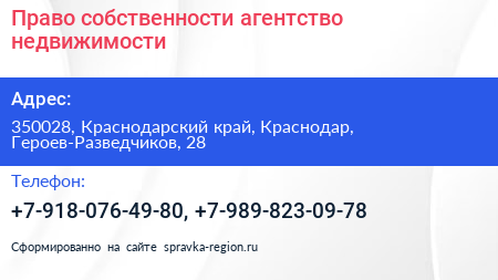 Право собственности, агентство недвижимости по адресу 350028, Краснодарский край, Краснодар, Героев-Разведчиков, 28 в дальнейшем Организация, размещена в следующих категориях: