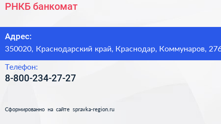 РНКБ, банкомат по адресу 350020, Краснодарский край, Краснодар, Коммунаров, 276 в дальнейшем Организация, размещена в следующих категориях: