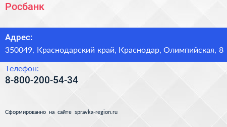 Росбанк по адресу 350049, Краснодарский край, Краснодар, Олимпийская, 8 в дальнейшем Организация, размещена в следующих категориях: