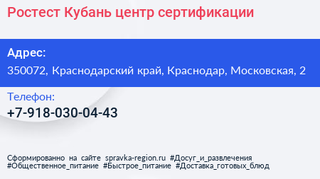 Ростест Кубань, центр сертификации по адресу 350072, Краснодарский край, Краснодар, Московская, 2 в дальнейшем Организация, размещена в следующих категориях: