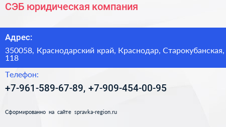 СЭБ, юридическая компания по адресу 350058, Краснодарский край, Краснодар, Старокубанская, 118 в дальнейшем Организация, размещена в следующих категориях: