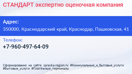 СТАНДАРТ, экспертно-оценочная компания по адресу 350000, Краснодарский край, Краснодар, Пашковская, 41 в дальнейшем Организация, размещена в следующих категориях: