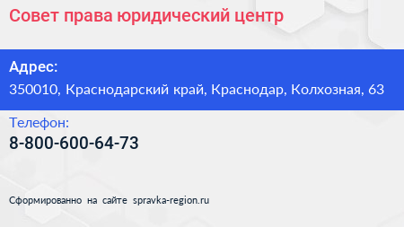 Совет права, юридический центр по адресу 350010, Краснодарский край, Краснодар, Колхозная, 63 в дальнейшем Организация, размещена в следующих категориях: