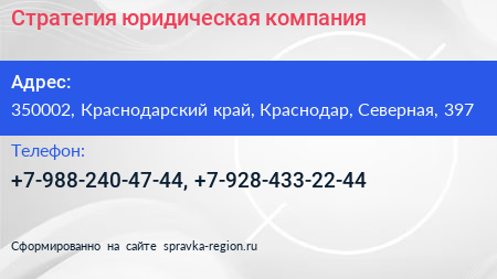 Стратегия, юридическая компания по адресу 350002, Краснодарский край, Краснодар, Северная, 397 в дальнейшем Организация, размещена в следующих категориях: