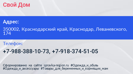 Свой Дом по адресу 350002, Краснодарский край, Краснодар, Леваневского, 174 в дальнейшем Организация, размещена в следующих категориях: