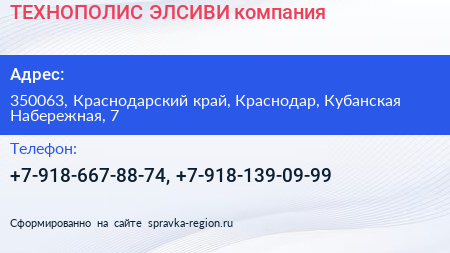 ТЕХНОПОЛИС-ЭЛСИВИ, компания по адресу 350063, Краснодарский край, Краснодар, Кубанская Набережная, 7 в дальнейшем Организация, размещена в следующих категориях: