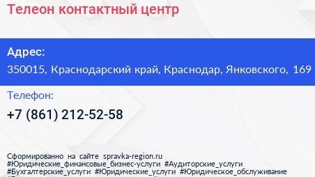 Для связи с организацией воспользуйтесь номером телефона: +7 (861) 212-52-58. Пн: c 09:00-18:00, Вт: c 09:00-18:00, Ср: c 09:00-18:00, Чт: c 09:00-18:00, Пт: c 09:00-18:00, Сб: выходной, Вс: выходной, вы можете обратиться в эту организацию.