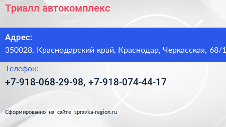 Триалл, автокомплекс по адресу 350028, Краснодарский край, Краснодар, Черкасская, 68/1 в дальнейшем Организация, размещена в следующих категориях: