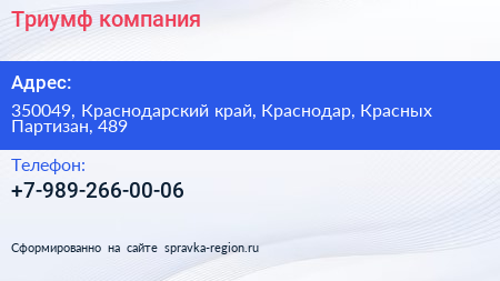 Триумф, компания по адресу 350049, Краснодарский край, Краснодар, Красных Партизан, 489 в дальнейшем Организация, размещена в следующих категориях: