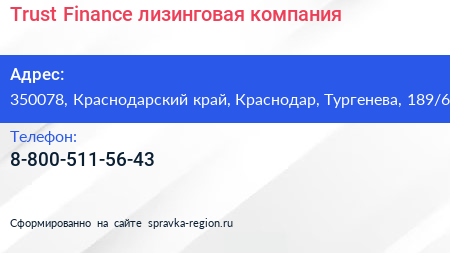 Trust Finance, лизинговая компания по адресу 350078, Краснодарский край, Краснодар, Тургенева, 189/6 в дальнейшем Организация, размещена в следующих категориях:
