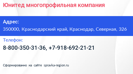Юнитед, многопрофильная компания по адресу 350000, Краснодарский край, Краснодар, Северная, 326 в дальнейшем Организация, размещена в следующих категориях: