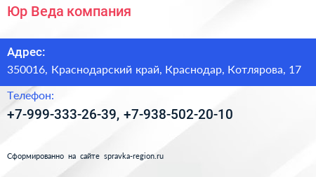 Юр-Веда, компания по адресу 350016, Краснодарский край, Краснодар, Котлярова, 17 в дальнейшем Организация, размещена в следующих категориях:
