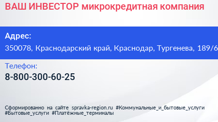 ВАШ ИНВЕСТОР, микрокредитная компания по адресу 350078, Краснодарский край, Краснодар, Тургенева, 189/6 в дальнейшем Организация, размещена в следующих категориях: