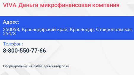 VIVA Деньги, микрофинансовая компания по адресу 350058, Краснодарский край, Краснодар, Ставропольская, 254/3 в дальнейшем Организация, размещена в следующих категориях: