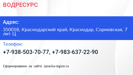 ВОДРЕСУРС по адресу 350018, Краснодарский край, Краснодар, Сормовская, 7 лит Ц в дальнейшем Организация, размещена в следующих категориях: