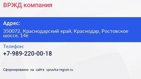 ВРЖД, компания по адресу 350072, Краснодарский край, Краснодар, Ростовское шоссе, 14е в дальнейшем Организация, размещена в следующих категориях: