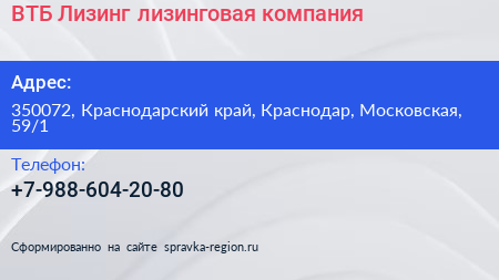 ВТБ Лизинг, лизинговая компания по адресу 350072, Краснодарский край, Краснодар, Московская, 59/1 в дальнейшем Организация, размещена в следующих категориях: