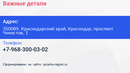 Важные детали по адресу 350089, Краснодарский край, Краснодар, проспект Чекистов, 1 в дальнейшем Организация, размещена в следующих категориях: