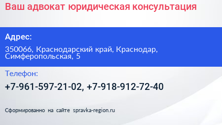 Ваш адвокат, юридическая консультация по адресу 350066, Краснодарский край, Краснодар, Симферопольская, 5 в дальнейшем Организация, размещена в следующих категориях: